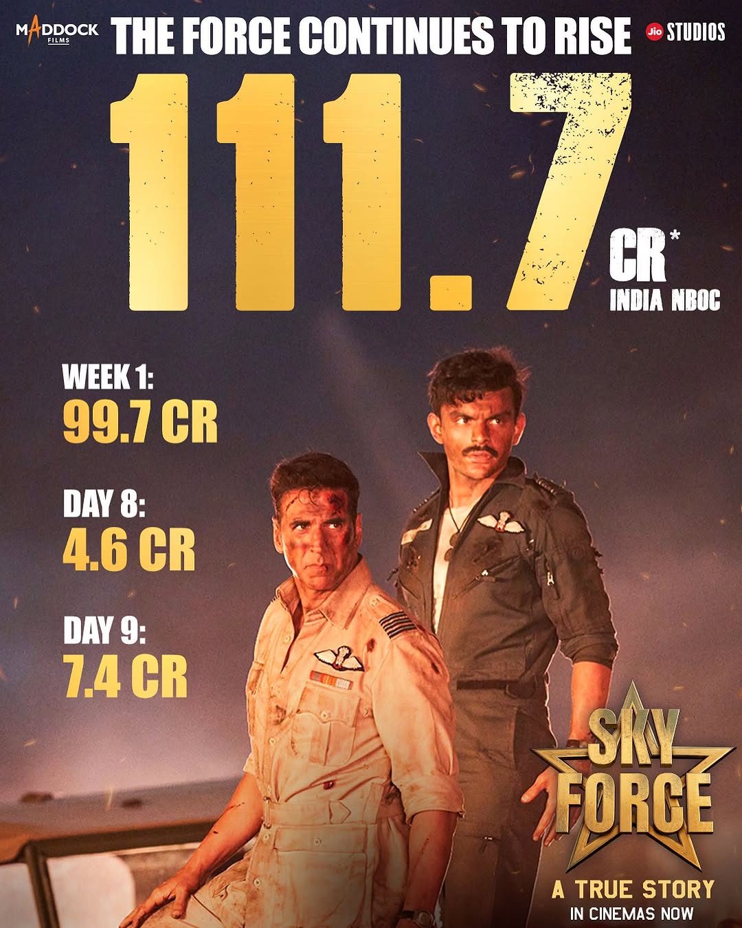 स्काई फोर्स अक्षय कुमार की कोरोना काल के बाद पहली ऐसी फिल्म मानी जा रही है जो बॉक्स ऑफिस पर सफल साबित हुई है। फिल्म में अक्षय कुमार के साथ साथ वीर पहाड़िया और सारा अली खान भी नजर आ रहे हैं। दिनेश विजन की कंपनी मैडॉक फिल्म्स ने अपने ऑफिशियल इंस्टा हैंडल पर दावा किया कि फिल्म ने सिर्फ भारत में ही पहले नौ दिन में करीब 111 करोड़ की कमाई की है मगर ट्रेड एनालिस्ट कहते हैं कि कलेक्शन बिना बिकी टिकटों के हैं।