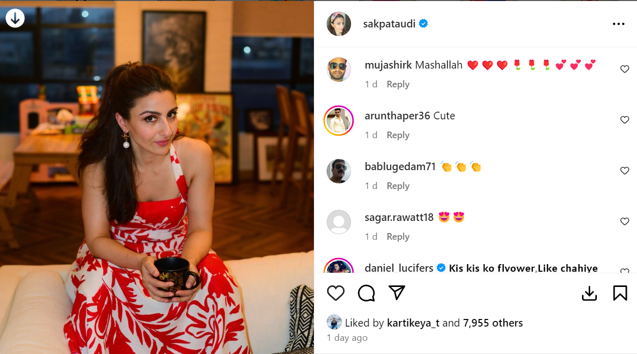सोहा की इस तस्वीर पर कुछ यूजर्स ने wow तो किसी ने माशाअल्लाह कहकर कमेंट किया।