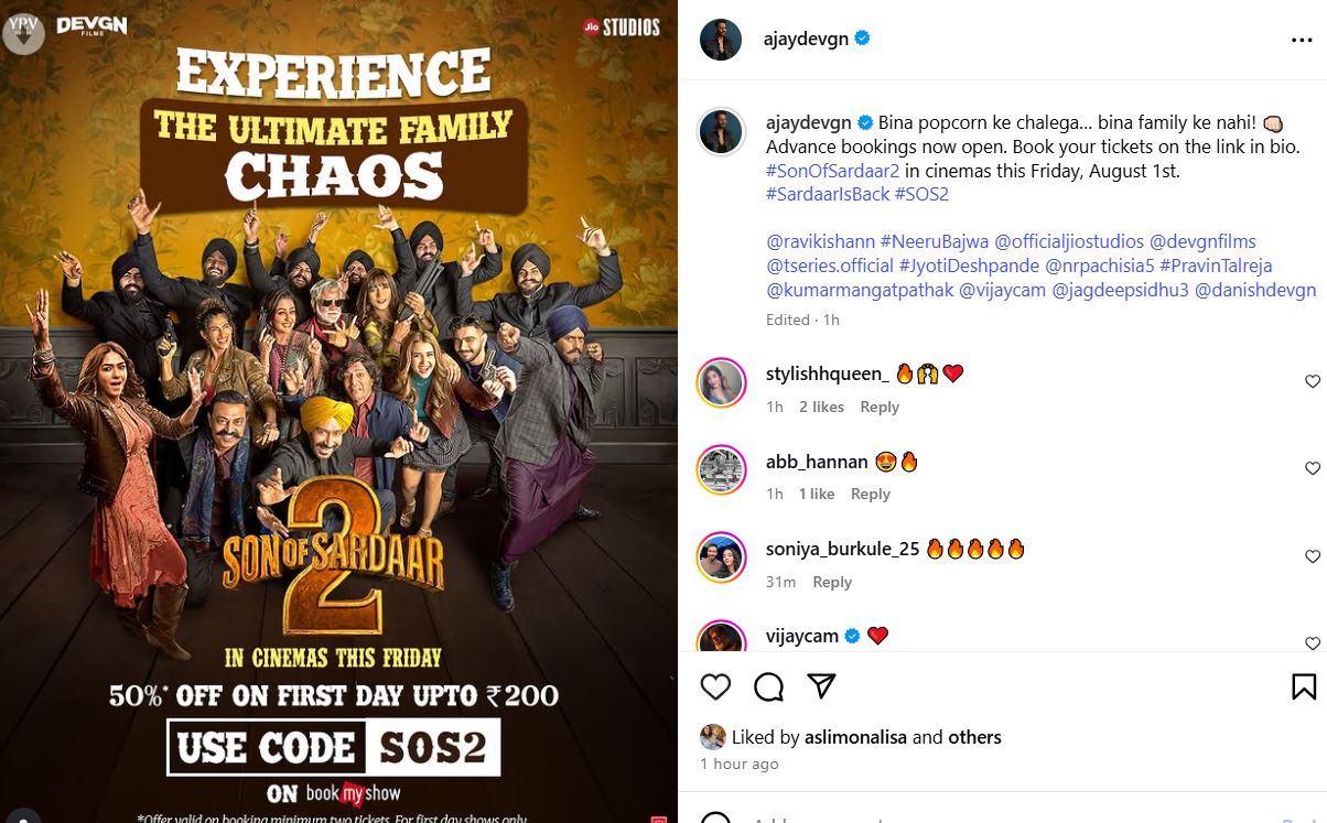 सन ऑफ सरदार 2 की एडवांस शुरू होने के साथ ही अजय देवगन ने हाल ही में अपने आधिकारिक इंस्टाग्राम पर एक पोस्ट शेयर की है, जिसमें वह फर्स्ट डे फिल्म का शो देखने वालों के लिए एक बंपर ऑफर लेकर आए हैं। पहले दिन यानी कि शुक्रवार को अगर आप फिल्म का ये शो देखते हैं और 200 रुपए की ऊपर की टिकट खरीदते हैं, तो आपको उस पर 50 परसेंट का डिस्काउंट मिलेगा।