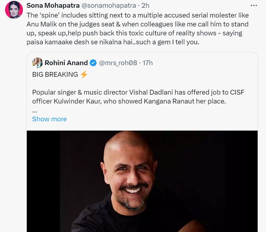 सोना मोहापात्रा ने कमेंट किया, 'जिस 'स्पाइन' की बात हो रही है, वो मल्टिपल एक्यूस्ड सीरियल मोलेस्टर अनु मलिक जैसे लोगों के बगल में जजेस सीट पर बैठते हैं और जब मेरे जैसे कलीग्स उन्हें रियलिटी शो के टॉक्सिक कल्चर पर बोलने के लिए कहते हैं, यह कहते हुए कि पैसा कमाके देश से निकलना है...।''