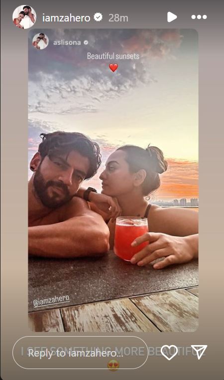 सोनाक्षी सिन्हा ने पति जहीर इकबाल के साथ रोमांस करते हुए भी तस्वीरें शेयर की हैं। एक फोटो में कपल स्विमिंग पूल में है और सोनाक्षी ने अपने हाथ में जूस लिया है। वह पति के कंधे पर हाथ रखकर दूसरी ओर देख रही हैं, जबकि जहीर की नजर कैमरे की ओर है। सोनाक्षी ने कैप्शन में लिखा है, "खूबसूरत सनसेट।" इसी फोटो को जहीर ने रीशेयर करते हुए लिखा, "मैं उससे ज्यादा कुछ और खूबसूरत देख रहा हूं।"