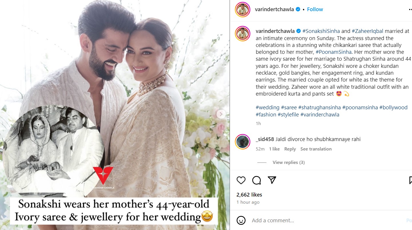 अपने डे को स्पेशल बनाने के लिए सोनाक्षी ने कोई कसर नहीं छोड़ी। सामने आई जानकारी के अनुसार एक्ट्रेस ने 44 साल पुरानी साड़ी पहनी थी। सेलिब्रिटी फोटोग्राफर वरिंदर चावला के पोस्ट के अनुसार, शत्रुघ्न सिन्हा से शादी के दौरान पूनम सिन्हा ने इसी साड़ी को पहना था। उन्होंने इसकी एक फोटो भी शेयर की। सोनाक्षी ने भी अपनी शादी के दिन इसी साड़ी को कैरी किया।