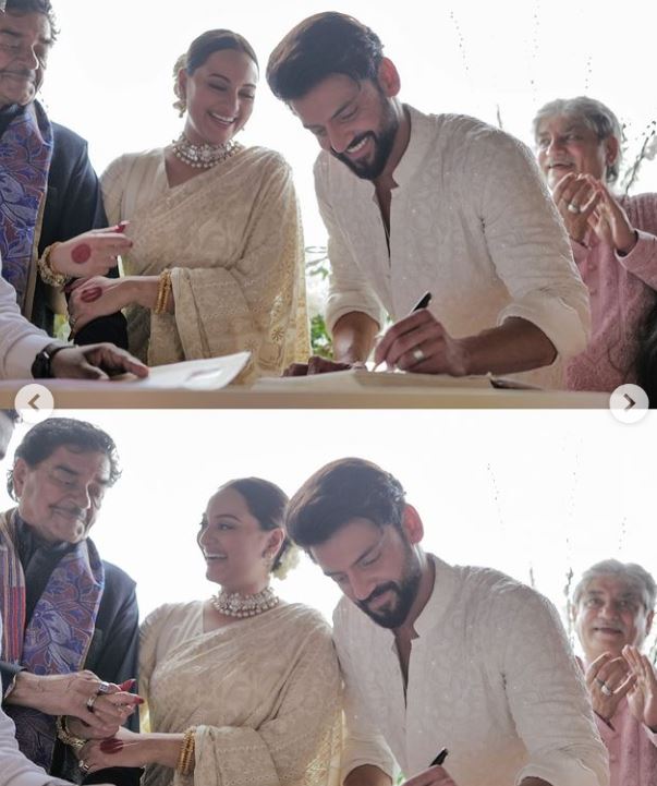 दूसरी फोटो में वह अपने परिवार के साथ नजर आ रहे हैं और जहीर पेपर पर साइन कर रहे हैं। आखिरी फोटो में सोनाक्षी, जहीर को साइड हग करते हुए फोटो क्लिक करा रही हैं।