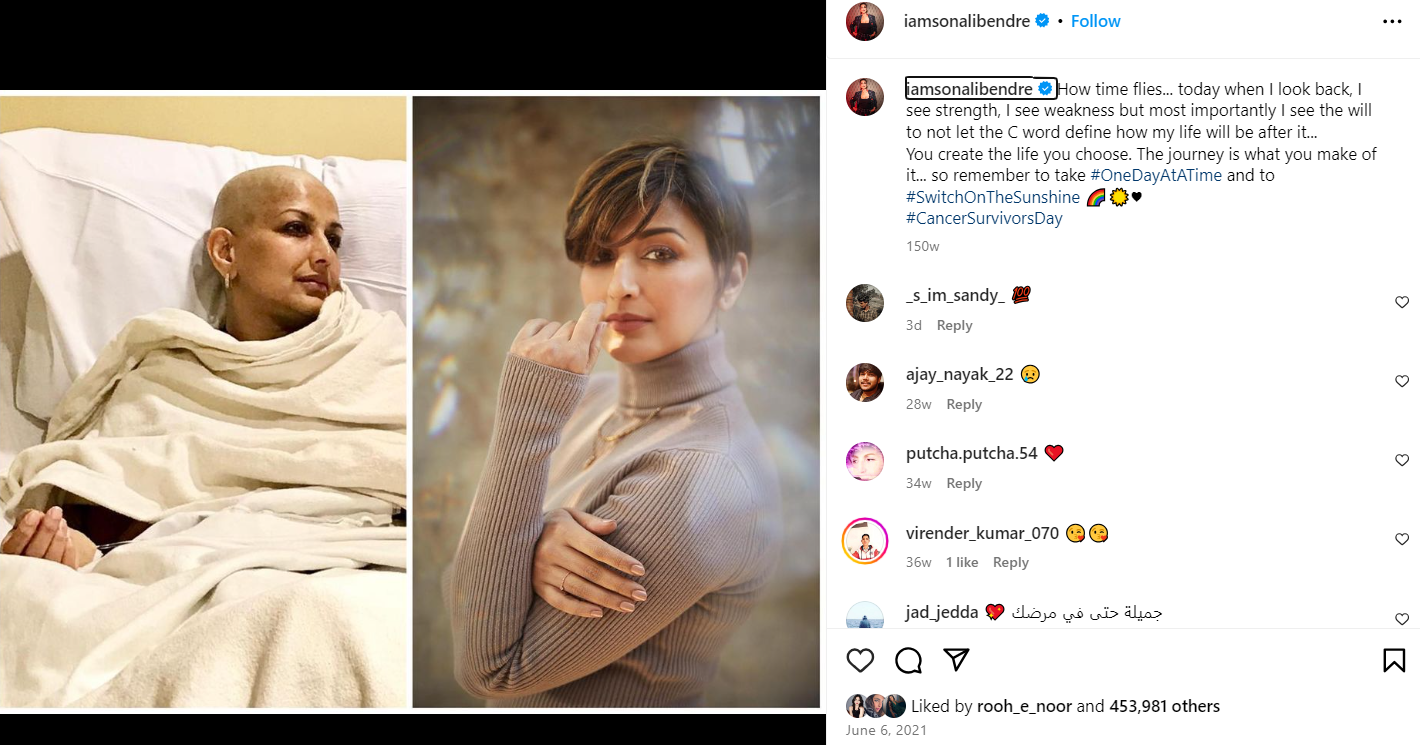 बता दें, सोनाली को 2018 में स्टेज फॉर मेटास्टेटिक कैंसर का पता चला था। न्यूयॉर्क सिटी अस्पताल में इलाज के बाद वह 2021 में कैंसर मुक्त हो गईं। ठीक होने के बाद वह कैंसर से बचे लोगों के लिए जागरूकता और समर्थन करती रही हैं। अभिनेत्री ने 2021 में कैंसर सर्वाइवर्स डे पर एक इंस्टाग्राम पोस्ट शेयर किया था, जिसमें लिखा था- “समय कैसे उड़ जाता है…आज जब मैं पीछे मुड़कर देखता हूं, तो मुझे ताकत दिखाई देती है, मुझे कमजोरी दिखाई देती है, लेकिन सबसे महत्वपूर्ण बात यह है कि मैं सी शब्द को न जाने देने की इच्छाशक्ति देखता हूं।” परिभाषित करें कि इसके बाद मेरा जीवन कैसा होगा... आप जो जीवन चुनते हैं उसका निर्माण करते हैं। यात्रा वही है जो आप बनाते हैं।