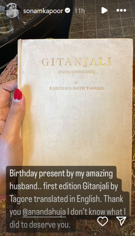 सोनम कपूर के जन्मदिन पर पति आनंद आहूजा ने उन्हें एक खास तोहफा भी दिया है, जिसे पाकर एक्ट्रेस गदगद हो गईं। आनंद ने अपनी बीवी को रबींद्रनाथ टैगोर की लिखी किताब गीतांजलि गिफ्ट की है। एक्ट्रेस ने इंस्टाग्राम स्टोरी पर किताब की फोटो शेयर करते हुए लिखा, "मेरे अमेजिंग पति से मिला बर्थडे गिफ्ट। टैगोर की लिखी फर्स्ट एडिशन गीतांजलि इंग्लिश में ट्रांसलेटेड है। धन्यवाद आनंद। मुझे नहीं पता कि मैं क्या करूं जो आप डिजर्व करते हैं। "