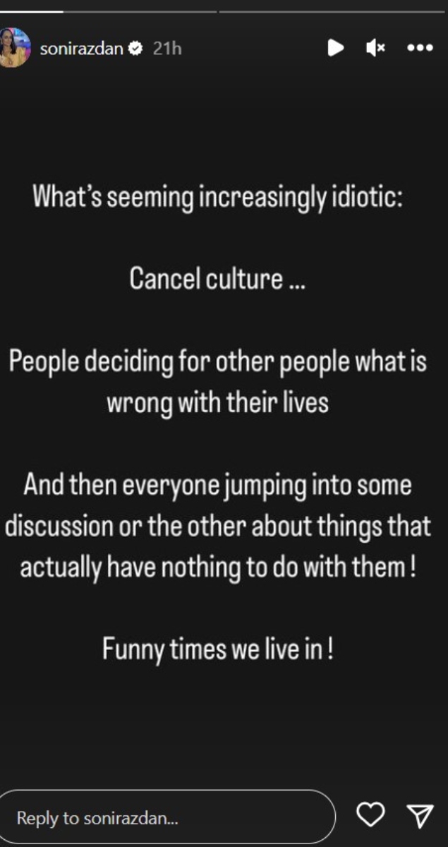 अब सोनी राजदान का भी क्रिप्टिक पोस्ट सामने आया है, जहां वह बेवजह के मुद्दे बनाकर चर्चा करने वालों पर ताना मारती नजर आ रही हैं। सोनी ने लिखा, 'क्या है, बेवकूफी बढ़ती जा रही है। कैंसिल कल्चर....अब लोग तय करेंगे कि दूसरे लोगों की जिंदगी में क्या सही है क्या नहीं। फिर दूसरे लोग भी इसे मुद्दा बनाएंगे और जबरदस्ती का घुसेंगे। जबकि इससे उनका कोई लेना देना भी नहीं है। इस फनी जमाने में जी रहे हैं हम लोग।'