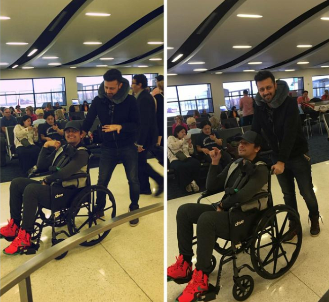 बॉलीवुड के सेलिब्रेटिड सिंगर सोनू निगम और पाकिस्तान के जाने-माने सिंगर आतिफ असलम इन दिनों विदेशी टूर पर हैं। इनकी ये तस्वीर किसी एयरपोर्ट पर ली गई है। तस्वीर में सोनू व्हीलचेयर पर बैठे हैं, जबकि आतिफ उसे पुश करते दिख रहे हैं। दोनों के चेहरे के भाव देखकर लगता है जैसे कुछ हंसी-मजाक भी चल रहा है।