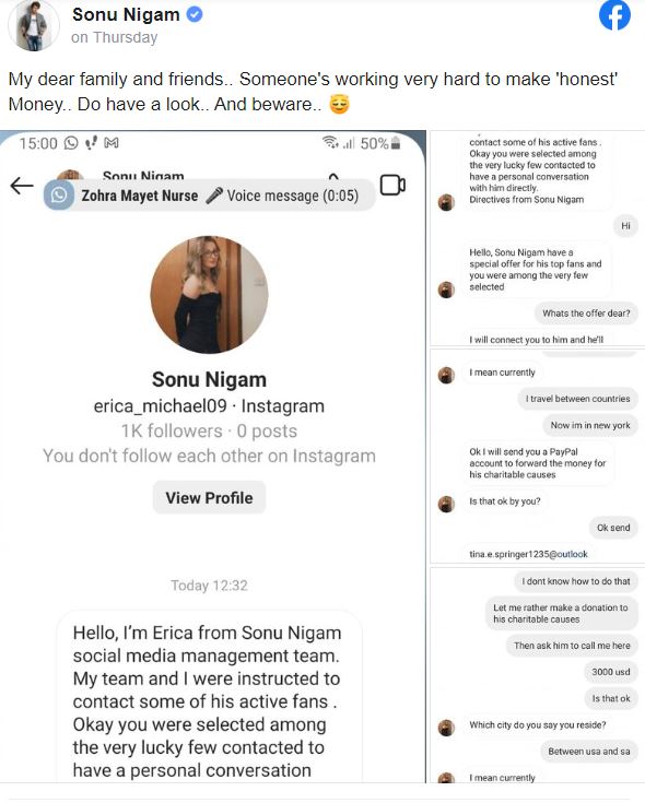 सोनू निगम ने फेसबुक पर कुछ स्क्रीनशॉट सीरीज शेयर किए, जिनमें एक व्यक्ति की फर्जी अकाउंट के साथ बातचीत दिखाई गई है। दरअसल, एरिका नाम की एक महिला सोशल मीडिया पर सोनू निगम की मैनेजमेंट टीम से होने का दावा कर रही है और गायक के फैंस से संपर्क कर रही है।