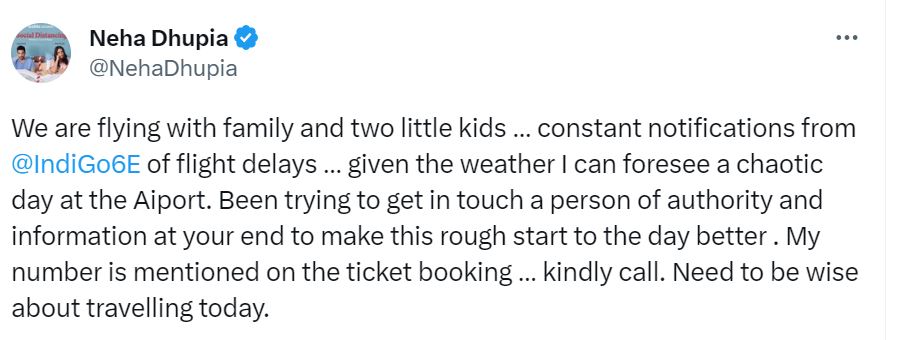 नेहा धूपिया ने अपने ट्वीट में लिखा, "दिन की इस कठिन शुरुआत को बेहतर बनाने के लिए ऑथोरिटी के किसी अधिकारी और जानकार व्यक्ति से संपर्क करने का प्रयास कर रही हूं। टिकट काउंटर पर मेरा नंबर है, प्लीज कॉल कीजिए। आज यात्रा करने में समझदारी बरतने की जरूरत है।"
