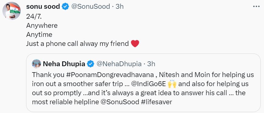नेहा धूपिया ने जैसे ही ट्वीट किया, इंडिगो और सोनू सूद ने मिलकर उनकी इस उलझन को सुलझा दिया। एक्ट्रेस ने दोबारा पोस्ट शेयर कर सोनू सूद और इंडिगो को शुक्रिया किया। साथ ही उन्होंने एक्टर को 'सबसे रिलाएबल हेल्पलाइन' बताया। एक्टर ने नेहा का जवाब देते हुए ट्वीट किया, "24 घंटे, कहीं भी, किसी भी टाइम, बस एक कॉल मेरे दोस्त।"