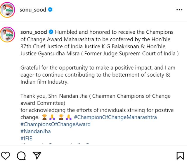 चैंपियंस ऑफ चेंज अवॉर्ड पाकर गदगद हुए Sonu Sood, इस तरह सोशल मीडिया पर जताई खुशी