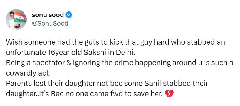 Sakshi Murder Case: साक्षी मर्डर केस पर सोनू सूद का फूटा गुस्सा, कहा- 'अपराध को नजरअंदाज करना कायराना हरकत है'