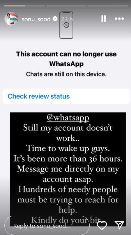 इसके बाद शनिवार को उन्होंने इंस्टाग्राम पर पोस्ट शेयर कर इसे ठीक करने की गुहार लगाई और लिखा कि अभी भी मेरा वॉट्सऐप अकाउंट काम नहीं कर रहा है। दोस्तों जागने का समय आ गया है। 36 घंटे से ज्यादा हो गए, मुझे सीधे मेरे अकाउंट पर मैसेज करें। सैकड़ों जरूरतमंद लोग मदद के लिए पहुंचने की कोशिश कर रहे होंगे।