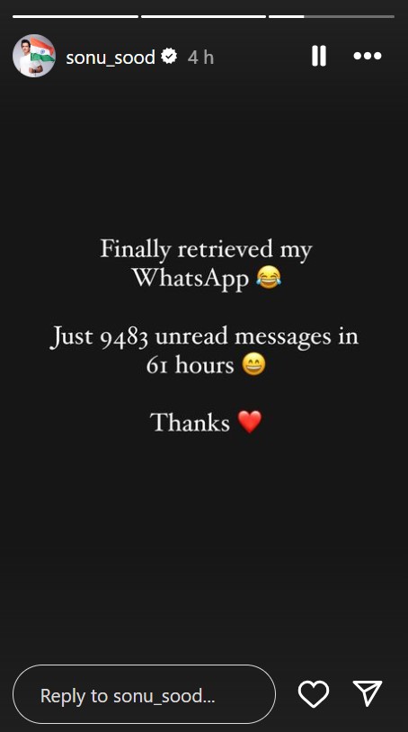 सोनू सूद का वॉट्सऐप अकाउंट फिर से एक्टिव हो गया है। उन्होंने अपने सोशल मीडिया हैंडल इंस्टाग्राम की स्टोरी पर इसकी जानकारी देते हुए लिखा कि आखिरकार मेरा वॉट्सऐप फिर से चालू हो गया है। 61 घंटे में 9483 अनरीड मैसेज मिले, धन्यवाद।