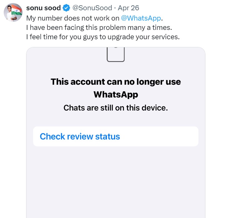 सोनू सूद ने बीते दिन सोशल मीडिया हैंडल एक्स पर एक पोस्ट किया था। इस पोस्ट में उन्होंने अपने वॉट्सऐप से जुड़ी एक तस्वीर शेयर की थी और इसके साथ ही लिखा कि मेरा नंबर काम नहीं कर रहा। मुझे कई बार इस समस्या का सामना करना पड़ा है। मुझे लगता है कि आप लोगों के लिए अपनी सेवाओं को उन्नत करने का समय आ गया है।