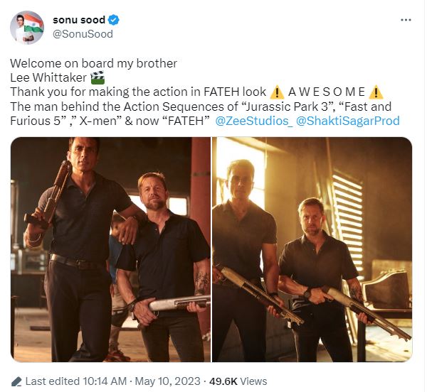 सोनू सूद ने हाल ही में अपने ट्विटर अकाउंट पर हॉलीवुड के एक्टर और स्टंटमैन ली विटकर के साथ दो तस्वीरें शेयर की। इन तस्वीरों में हाथों में गन थामे सोनू सूद और एक्शन डायरेक्टर ब्लैक आउटफिट में नजर आ रहे हैं। तस्वीरों को शेयर करते हुए सोनू सूद ने कैप्शन में लिखा, 'ली विटकर, आपका बहुत-बहुत स्वागत है।