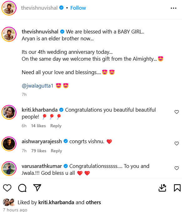 दिल छू लेने वाली इन दोनों तस्वीरों को शेयर करते हुए विष्णु विशाल ने कैप्शन में लिखा, "भगवान के आशीर्वाद से हमारे घर बेटी ने जन्म लिया है। अब आर्यन बड़ा भाई बन गया है। आज हमारी चौथी वेडिंग एनिवर्सरी है। इसी दिन हमें सर्वशक्तिमान ने सेम दिन पर दुनिया का सबसे प्यारा तोहफा दिया है। हमें आप सबके प्यार और आशीर्वाद की जरूरत है"।