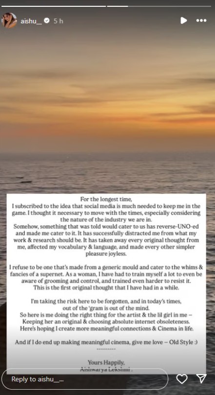 फिल्मों के लिए सोशल मीडिया को अलविदा कहने वाली एक्ट्रेस हैं ऐश्वर्या लक्ष्मी। ऐश्वर्या लक्ष्मी ने इंस्टाग्राम छोड़ने से पहले एक लंबा नोट लिखा। उन्होंने बताया कि सोशल मीडिया ने उनका ध्यान उनके काम से हटा दिया, उनकी मौलिकता छीन ली और छोटी-छोटी खुशियों से भी एंजॉय खत्म कर दिया।