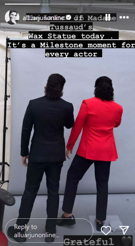 अल्लू अर्जुन ने अपने सोशल मीडिया हैंडल इंस्टाग्राम की स्टोरी पर एक फोटो शेयर की है, जिसमें वह अपने वैक्स स्टैच्यू के साथ पुष्पा स्टाइल में खड़े दिखाई दे रहे हैं। इस पोस्ट को शेयर करते हुए उन्होंने कैप्शन में लिखा, "आज मैडम तुसाद में वैक्स स्टैच्यू का अनावरण किया। यह हर एक्टर के लिए माइलस्टोन मोमेंट है।