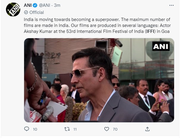 क्लोजिंग सेरेमनी पर बॉलीवुड एक्टर अक्षय कुमार मौजूद रहे। एएनआई से बात करते हुए उन्होंने कहा, 'भारत सुपर पावर बनने की ओर बढ़ रहा है। सबसे ज्यादा फिल्में भारत में बनती हैं। हमारे यहां कई भाषाओं में फिल्में बनाई जाती हैं।'