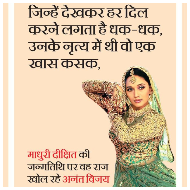 वो हिंदी सिनेमा में अबोध बनकर तो आईं मगर तेजाब बनकर छा गईं। माधुरी दीक्षित वो नाम जिनको देखकर दिल तो पागल होता ही है इश्क थोड़ा ज्यादा होकर डेढ़ गुणा बढ़ जाता है। वो हिंदी सिनेमा का ऐसा गुलाब हैं जो दयावान होकर अगर पूछती हैं कि हम आपके हैं कौन तो कुछ कहने को नहीं बचता। चंद्रमुखी माधुरी दीक्षित की जन्मतिथि (15 मई) पर अनंत विजय का आलेख...
