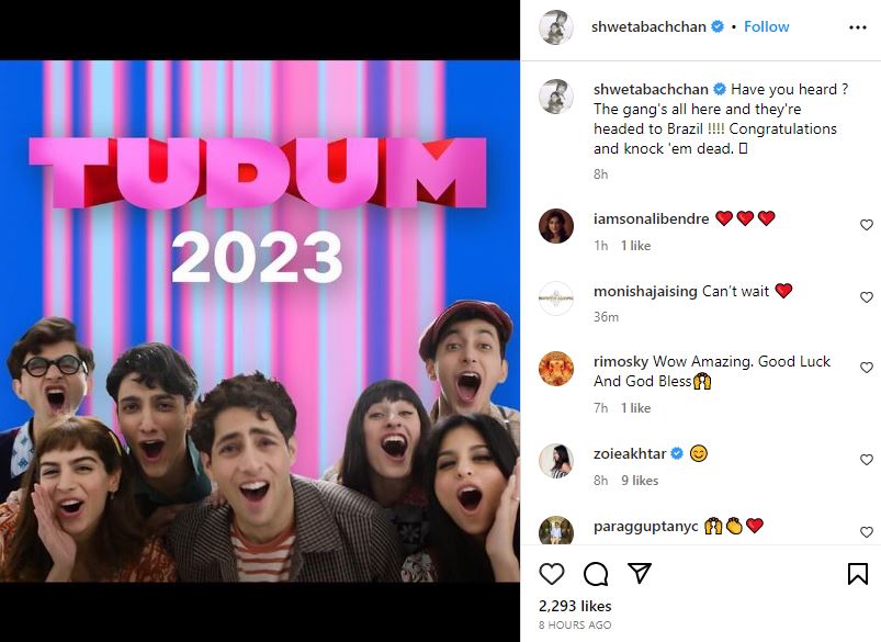 सुहाना खान-अगस्त्य नंदा और खुशी कपूर सहित 'द आर्चीज' की टीम के ब्राजील के साओ पाउलो में होने वाले इस इवेंट में शामिल होने पर श्वेता बच्चन ने अपनी खुशी व्यक्त की है। उन्होंने टुडम-2023 के बारे में पोस्ट करते हुए सुहाना खान, खुशी कपूर, अगस्त्य नंदा सहित पूरी कास्ट का एक पोस्टर शेयर किया है, जिसे शेयर करते हुए उन्होंने लिखा, "क्या आपने सुना, ये पूरी गैंग ब्राजील जा रही है।
