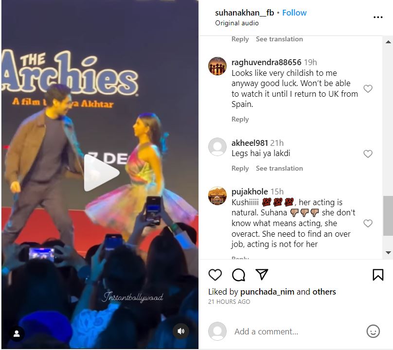 अभिनय क्षेत्र इनके लिए नहीं है"। हालांकि, इस बीच कई फैंस सुहाना के सपोर्ट में भी सामने आए और उनके परफॉर्मेंस को जानदार बताया।