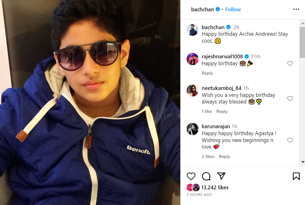 बर्थडे पर मामा अभिषेक बच्चन ने अगस्त्य की एक फोटो शेयर करते हुए उन्हें विश किया है। अभिषेक बच्चन ने इंस्टाग्राम पर भांजे की बचपन की फोटो शेयर की है और कैप्शन में लिखा, जन्मदिन मुबारक हो आर्ची एंड्रयूज।