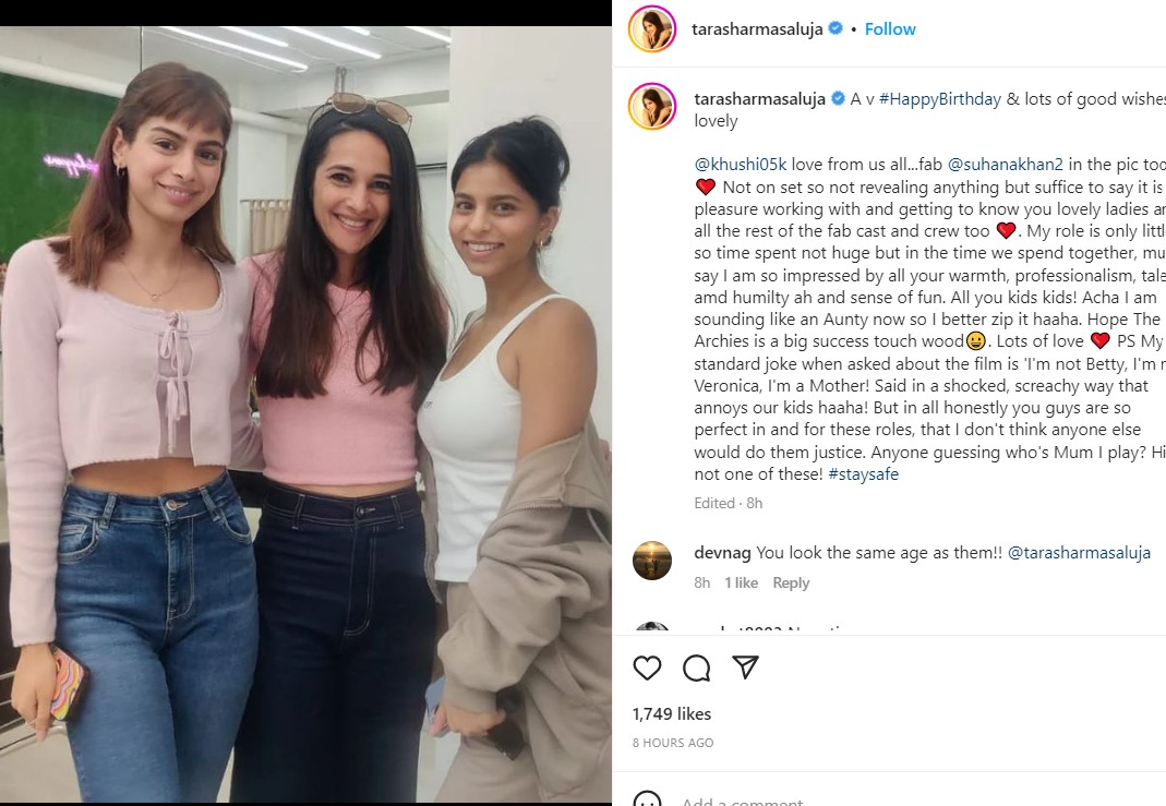 तारा शर्मा सलूजा ने सोशल मीडिया पर सुहाना और खुशी के साथ सेट से स्माइल भरी फोटो शेयर की है। इसे कैप्शन देते हुए तारा ने लिखा, '@khushi05k को हम सभी की तरफ से प्यार...@suhanakhan2 भी तस्वीर में हैं। अभी कुछ भी खुलासा नहीं कर रही हूं लेकिन यह कहना काफी है कि आपके साथ काम करना और आप दोनों को जानना एक खुशी है। मेरा रोल फिल्म में बहुत बड़ी नहीं है इसलिए सेट पर ज्यादा समय नहीं बिता पाते। लेकिन हम जो भी समय साथ बिता पाते हैं, मैं यह जरूर कहना चाहूंगी कि आपकी गर्मजोशी, प्रोफेशनैलिज्म, टैलेंट और मस्ती करने का हुनर कमाल का है। मैं उम्मीद करती हूं द आर्चीज सक्सेसफुल फिल्म साबित हो।'