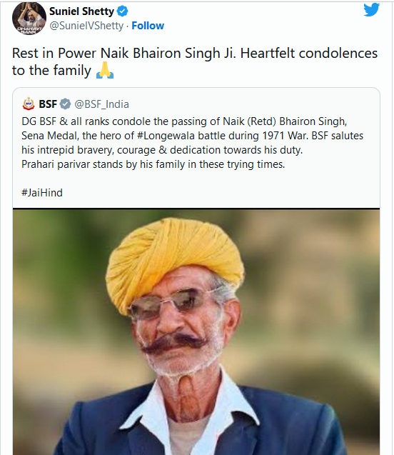 भैरों सिंह राठौर के निधन पर बॉलीवुड एक्टर सुनील शेट्टी काफी दुखी हैं। सुनील ने BSF ट्वीट को रीट्वीट करते हुए लिखा, 'रेस्ट इन पावर नायक भैरों सिंह जी। उनके परिवार के प्रति मेरी भावपूर्ण संवेदवाएं।' बता दें कि भैरों सिंह को न सिर्फ सुनील शेट्टी बल्कि कई अन्य लोगों ने भी उन्हें श्रद्धांजलि दी है।