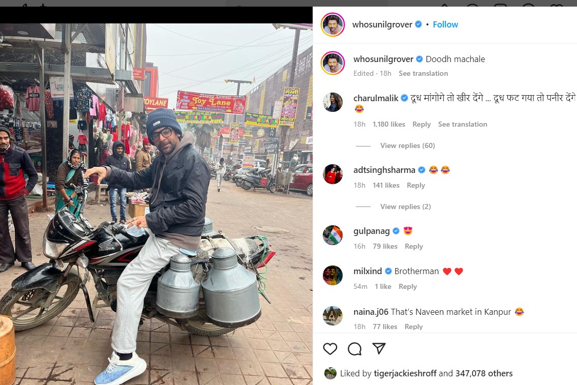सुनील ग्रोवर ने इंस्टाग्राम पर एक फोटो शेयर की है, जिसमें वह बाइक पर बैठे हैं। उनकी बाइक के दोनों साइड दूध के कंटेनर बंधे हुए हैं। इस तस्वीर के सामने आते ही लोगों की हंसी छूट गई। कोई उन्हें इस फोटो में देख हैरान है, तो किसी ने उनके मजे लिए हैं। वहीं, सुनील ग्रोवर के बहुत सारे फैंस ऐसे भी हैं, जिन्होंने उनके सेंस ऑफ ह्यूमर की तारीफ की है। आम जनता से लेकर सिलेब्रिटी फ्रेंड्स तक ने कड़ाके की सर्दी में उनके चेहरे पर प्यारी सी मुस्कान लाने के लिए उन्हें धन्यवाद किया है।