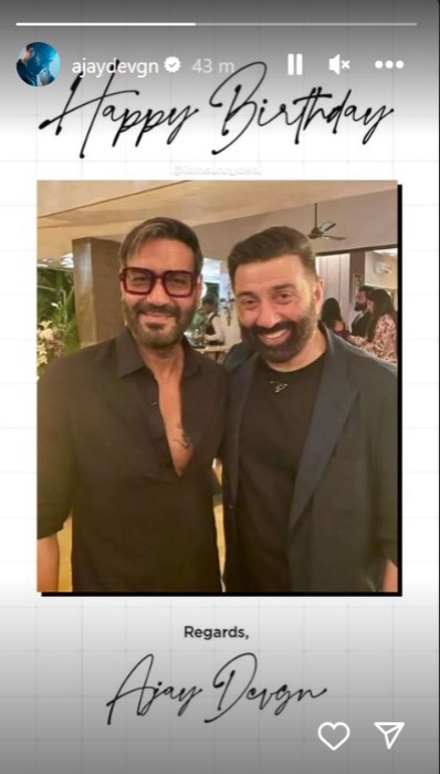 तस्वीरों के कैप्शन में बॉबी देओल ने लिखा है- 'लव यू भइया, जन्मदिन मुबारक हो।' इसके अलावा 'सिंघम अगेन' अभिनेता अजय देवगन ने अपनी इंस्टा स्टोरी में सनी देओल की फोटो शेयर कर हैप्पी बर्थडे लिखा है।