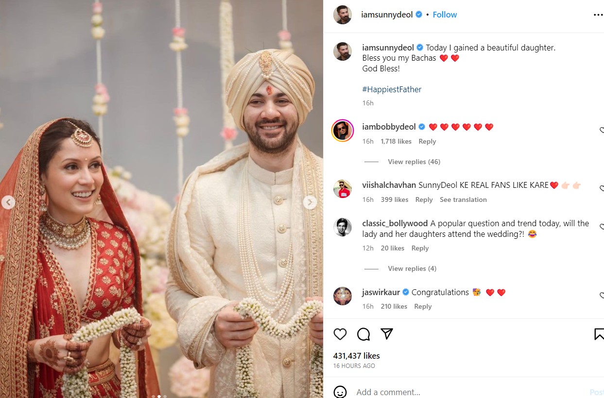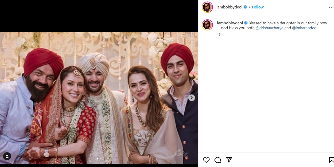 चाचा बॉबी देओल ने भी करण और द्रिशा का परिवार में अपने अंदाज में वेलकम किया। उन्होंने द्रिशा के लिए खूबसूरत पोस्ट शेयर किया, 'अब हमारे परिवार में एक बेटी होने का सौभाग्य मिला है…भगवान आप दोनों को आशीर्वाद दें।' इस पोस्ट पर रणवीर सिंह, पूनम ढिल्लौं सहित कई सितारों ने उन्हें बधाई दी है।