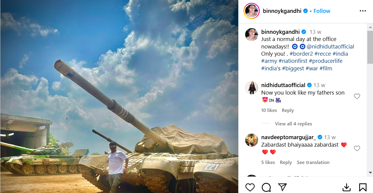 फोटो शेयर करते हुए टी सीरीज ने अपने इंस्टाग्राम पेज पर लिखा, बॉर्डर 2 के सीक्वल के लिए कैमरा रोल कर रहे हैं। सनी देओल, वरुण धवन, दिलजीत दोसांझ और अहान शेट्टी के साथ अनुराग सिंह की डायरेक्टोरियल फिल्म की तैयारी शुरू हो चुकी है। अपने कैलेंडर मार्क कर लें। #Border2 23 जनवरी, 2026 को सिनेमाघरों में रिलीज होगी!"