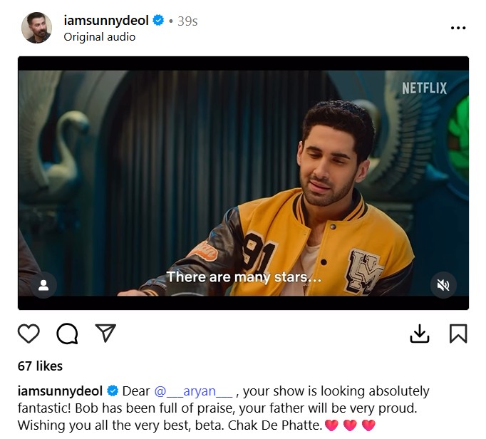सनी ने अपने ऑफिशियल इंस्टाग्राम हैंडल पर सीरीज के प्रिव्यू वीडियो को शेयर करते हुए लिखा है-प्रिय आर्यन तुम्हारा शो काफी शानदार लग रहा है। बॉब (बॉबी देओल) ने तुम्हारी काफी तारीफ की है। तुम्हारे पापा को तुम पर बहुत गर्व होगा। तुम्हें बहुत सारी ढ़ेर सारी शुभकानाएं बेटा, चक द पट्टे।