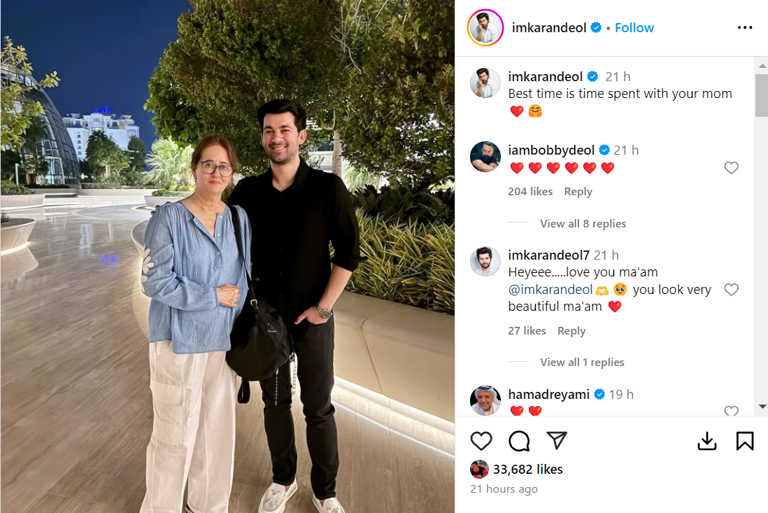 लेकिन अब एक्टर के बेटे करण ने लंबे समय बाद एक प्यारी सी तस्वीर सोशल मीडिया पर शेयर की है। फोटो में सनी देओल की पत्नी वेस्टर्न लुक में नजर आ रही हैं। उन्होंने व्हाइट ट्राउजर के साथ ब्लू शर्ट पहनी हुई थी। वहीं सनी के बेटे करण भी कैजुअल लुक में नजर आए। कैप्शन में लिखा,'सबसे अच्छा समय अपनी मां के साथ बिताया गया समय होता है।'