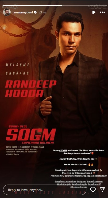 सनी देओल ने भी इंस्टा स्टोरी के साथ रणदीप हुड्डा का स्वागत किया। इसके अलावा फिल्म के मेकर्स में शामिल गोपीचंद मालिनेनी ने भी एक्स पर तस्वीर पोस्ट की और रणदीप हुड्डा को उनके जन्मदिन की शुभकामनाएं दीं। उन्होंने लिखा, "वर्सेटाइल एक्टर रणदीप हुड्डा सर का स्वागत है। टीम SDGM की ओर से आपको जन्मदिन की बहुत-बहुत बधाइयां।"