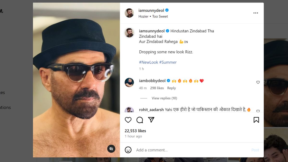 हिंदी सिनेमा के दमदार कलाकार सनी देओल (Sunny Deol) को भला कौन नहीं जानता है। गदर 2 के तारा सिंह के रूप में फैंस के दिलों में उनकी एक अलग छवि बनी हुई है। सोशल मीडिया पर सनी देओल का एक नया पोस्ट सामने आया है जिसमें नए लुक के साथ वह हिंदुस्तान जिंदाबाद का नारा लगा रहे हैं। उनके पोस्ट पर बॉबी देओल (Bobby Deol) ने कमेंट किया है।