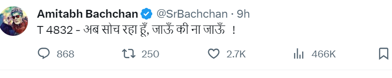 अब, सुपरस्टार इस दुविधा में फस गए हैं कि उन्हें रविवार, 19 नवंबर को वर्ल्ड कप का फाइनल देखना चाहिए या नहीं, क्योंकि पिछली बार जब उन्होंने मैच नहीं देखा था, तो भारत जीत गया था। भले ही अभिनेता ने सीधे तौर पर वर्ल्ड कप का जिक्र नहीं किया, लेकिन उनके पिछले ट्वीट को देखते हुए, वह शायद उसी के बारे में बात कर रहे हैं। उन्होंने जो एक और ट्वीट किया, उसमें लिखा 'अब सोच रहा हूं जाऊं की ना जाऊं'।