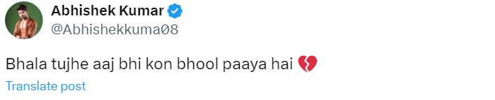बिग बॉस 17 के रनर अप अभिषेक कुमार दिवंगत अभिनेता सुशांत को अपनी प्रेरणा मानते रहे हैं। उन्हें कई बार रियलिटी शो में अंकिता के साथ उनके बारे में बात करते हुए भी देखा गया है। अब एक्स हैंडल पर अभिषेक ने लिखा कि भला तुझे आज भी कौन भूल पाया है। साथ ही उन्होंने इंस्टा स्टोरी पर 14 जून लिख कर दिल टूटने वाला इमोजी शेयर किया।