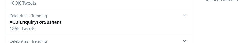 दरअसल, शुक्रवार को ट्विटर इंडिया पर लगातार #CBIEnquiryForSushant ट्रेंड कर रहा है। अब तक सुशांत के फैंस इस हैशटैग पर एक लाख से ज़्यादा ट्वीट कर चुके हैं। लोग इस बात की मांग कर रहे हैं कि सुशांत की डेथ के पीछे की बातों को जानने के लिए सीबीआई जांच होनी चाहिए। इससे पहले पूर्व सांसद पप्पू यादव भी इसकी मांग कर चुके हैं। सुशांत का परिवार भी सीबीआई जांच की मांग कर चुका है।