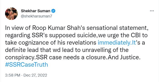 शेखर सुमन उन कलाकारों में से हैं, जो कि सुशांत सिंह राजपूत के लिए न्याय मांग रहे हैं। उन्होंने ट्विटर पर इस नए खुलासे के बाद एक बार फिर प्रतिक्रिया दी है। शेखर सुमन ने लिखा है, "रूप कुमार शाह के बयान के बाद मैं सीबीआई से निवेदन करता हूं कि वह उनकी बात को गंभीरता से लें। सुशांत सिंह राजपूत मामले में यह बहुत बड़ी लीड है और इसके चलते एक बहुत बड़े षड्यंत्र का खुलासा हो सकता है। सुशांत सिंह राजपूत केस को एक क्लोजर और न्याय चाहिए।"