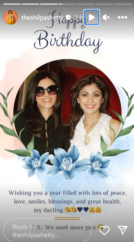 शिल्पा शेट्टी ने भी इंस्टाग्राम स्टोरी पर सुष्मिता सेन के साथ एक तस्वीर शेयर की है और उन्हें बर्थडे की शुभकामनाएं दी हैं। इसके अलावा 'आर्या' के डायरेक्टर राम माधवानी ने भी एक्ट्रेस को जन्मदिन की बधाई दी है।