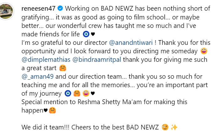 आप मेरी यात्रा का एक महत्वपूर्ण हिस्सा हैं। इसे संभव बनाने के लिए रेशमा शेट्टी मैम का विशेष उल्लेख। हमने यह कर दिखाया टीम। बेहतरीन बैड न्यूज के लिए चीयर्स।