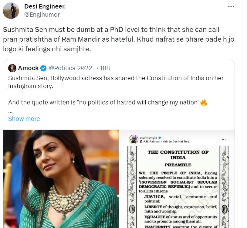 एक ने कहा, "500 सालों के संघर्ष के बाद राम मंदिर का निर्माण हुआ है। सुष्मिता सेन के लिए "नफरत की राजनीति" है। उदारवाद उनके दिमाग पर इतना हावी हो गया है कि वे धर्म के हिंदू प्रतीकों पर मुगलों के बर्बरता के इतिहास को भूल जाती हैं।"