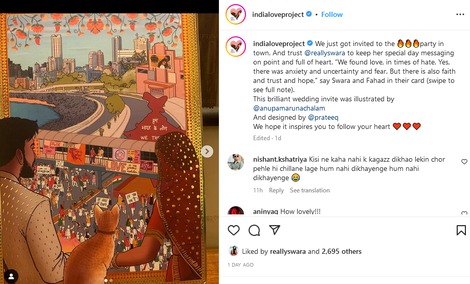 स्वरा भास्कर और फहद अहमद की इनविटेशन कार्ड में आपको मुंबई थीम देखने को मिलेगा। इसमें मुंबई में समंदर का किनारा, थिएटर में लगी शाहरुख खान की DDLJ मूवी का पोस्टर देखा जा सकता है। वहीं, सबवे के पास लोगों की भीड़ भी इसमें देखी जा सकती है। इस कार्ड पर अलग-अलग तरह के मैसेज लिखे हुए हैं। कार्ड पर 'हम देखेंगे', 'इंकलाब जिंदाबाद', 'हम सब एक हैं' और 'हम भारत के लोग' जैसे स्लोगन साफ देखा जा सकता है।