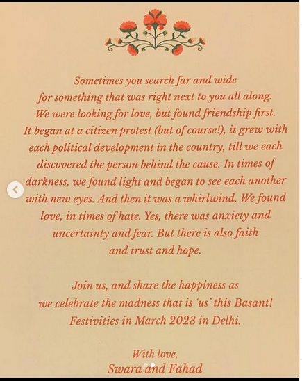 स्वरा भास्कर के कार्ड पर लिखा है, 'कई बार हम किसी चीज को बहुत दूर-दूर तक ढूंढते हैं, फिर अचानक ही हमें पता चलता है कि हम जिस चीज की तलाश कर रहे हैं, वो आपके पास ही थी। हम प्यार को ढूंढ रहे थे पर दोस्ती पहले मिल गई। इन सब की शुरुआत भले ही एक विरोध प्रदर्शन के साथ हुई, जो एक राजनीतिक घटना के साथ बढ़ता चला गया। उस अंधेरे में हमने रोशनी पाई और एक दूसरे को एक अलग नजरिए से देखा। नफरत के वक्त में हमने प्यार पाया।' स्वरा का ये कार्ड सोशल मीडिया पर छाया हुआ है।