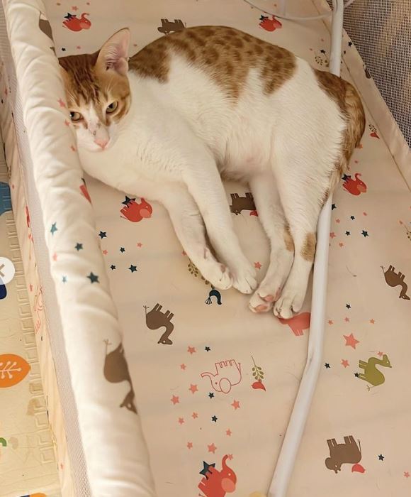 "नए मेहमान के स्वागत की तैयारी के लिए हमारे कमरे में एक पालना रखा गया है। यह देखने के लिए स्वाइप करें कि कौन उस पर हक जता रहा है। पालने में पहला रहने वाला, जिसने वहां से हटने से इनकार कर दिया।"