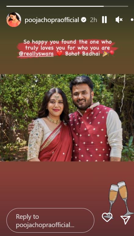 वहीं जहां चार यार में स्वरा की को-स्टार रहीं पूजा चोपड़ा ने भी स्वरा को विश किया है। उन्होंने अपनी इंस्टाग्राम स्टोरी में स्वरा को फोटो शेयर करते हुए उन्हें शुभकामनाएं दी हैं।
