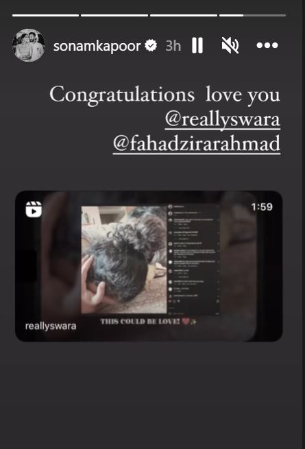 स्वरा की शादी की खबर सुनते ही कई बॉलीवुड सेलेब्स उन्हें सोशल मीडिया पर विश कर रहे हैं। इस लिस्ट में ऋचा चड्डा, सोनम कपूर और पूजा चोपड़ा का नाम शामिल है। सोनम कपूर ने अपनी इंस्टाग्राम स्टोरी में स्वरा का फोटो शेयर करते हुए उन्हें विश किया।